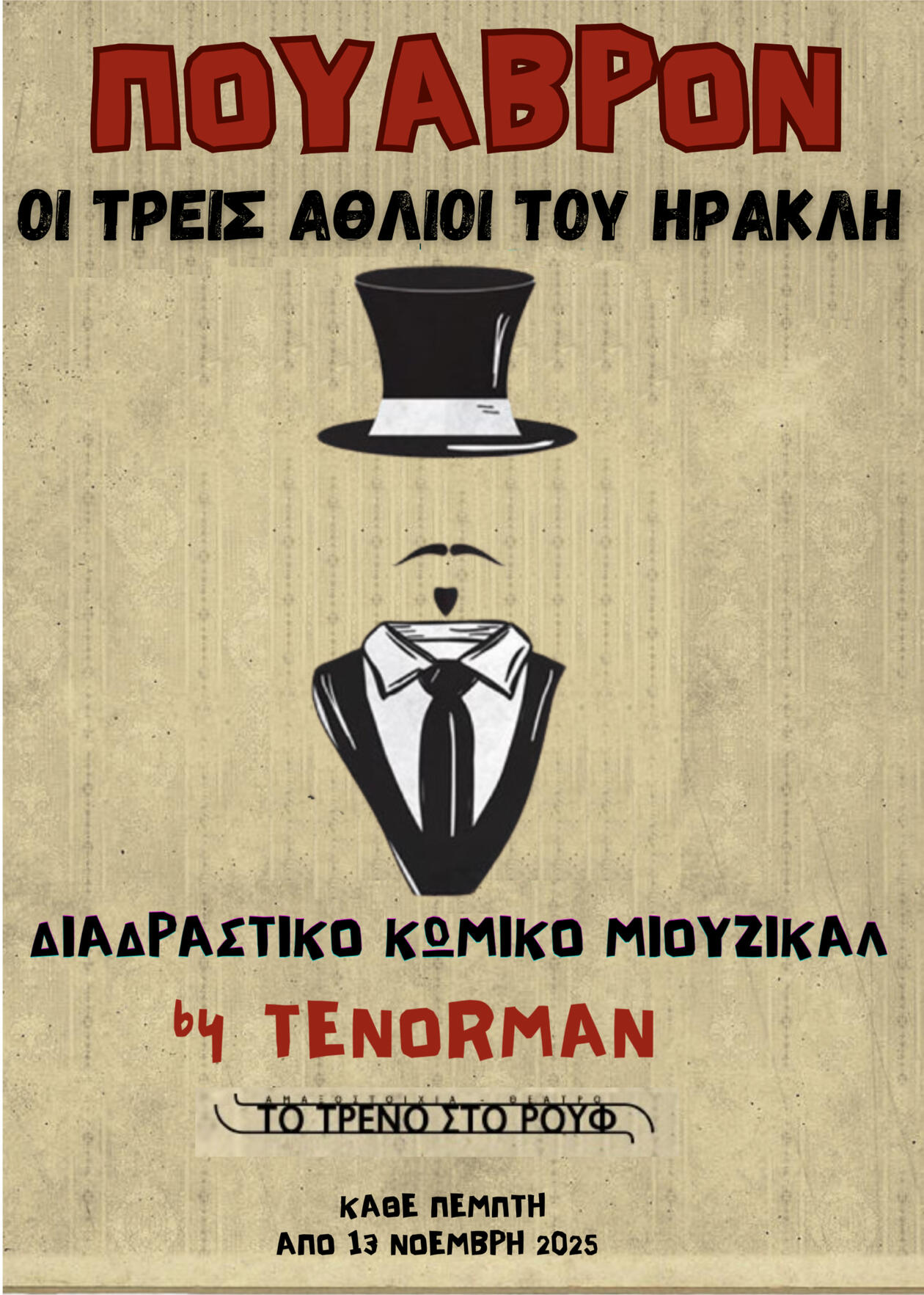 A disaster comedy show.George Tenorman Tziouvaras, after 20 countries and around 800 appearances with Opera Chaotique, collaborations with L. Mahairitsas, D. Savvopoulos, Tiger Lillies, Ennio Morricone, presents his new humorous music show: Dark Prince of the Cabaret: a comic adventure with tension and an unusual everyday superhero.The STORY